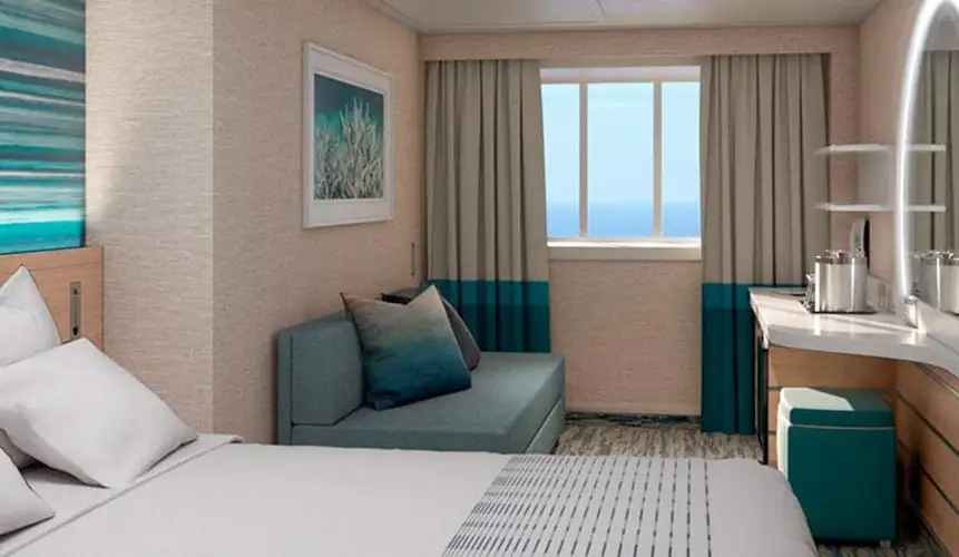 Your Ocean View cabin with a large panoramic window offers a beautiful view and plenty of natural light, enhancing the comfort of your stay. (Note: the view may be partially obstructed.)
