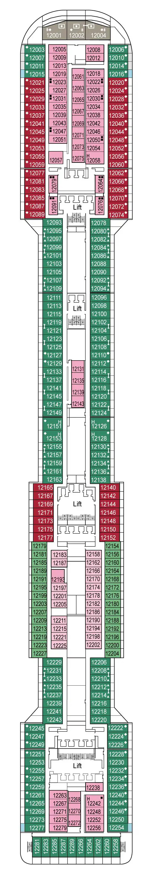 Surface area approx. 18 m², balcony approx. 4 m², deck 13, best location on the ship Living area with sofa Bathroom with shower or bathtub, beauty corner with hairdryer Comfortable double bed or two single beds (on request) Interactive TV, air conditioning, telephone, Wi-Fi connection (for a fee), safe and minibar
