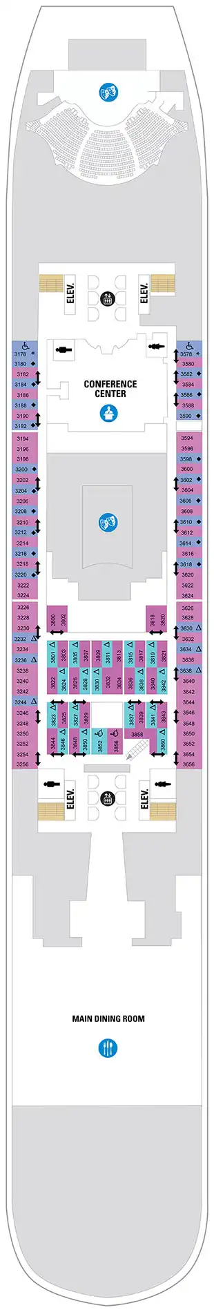 Two bedrooms. Master bedroom with two twin beds that convert to Royal King. Second bedroom has one double bed and two Pullman beds. Two bathrooms (master one with bathtub), living area with double sofa bed, private balcony and concierge service. Stateroom: 548 sq. ft. Balcony: 86 sq. ft.